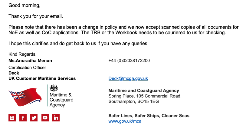 Be aware of the new Style Certificates for UK Seafarers and those working on UK ships Min 655 (it has expired, but they still refer to it)